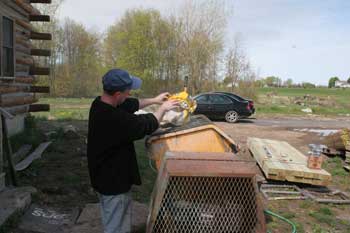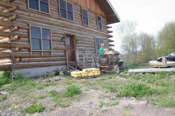 Our mixing area in front of the house.   Tom mixing another batch. The bundle of 4x6 deck ledger beams is visible on the right.