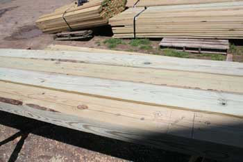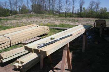 A partial pile of beams with bolt holes drilled out, spaced every foot.   Four beams at a time set up on saw horses for drilling.