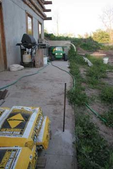 For the deck along the back of the house, above the basement entrance, log supports will sit on rebar pins atop concrete risers along the outer edge of the patio. First, Jeff drilled down through the 2" slab into the frost wall beneath, then drove in a long pin. This will stick up through the riser and into the log support. |