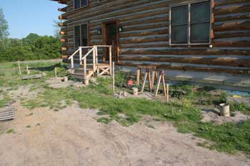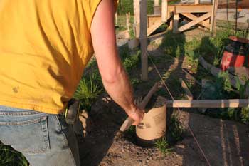 Placing a rebar pin in the riser at the desired distance away from the foundation wall using a measured stick. This pin will protrude up into a pressure-treated 6x6 post that will top off at deck level. |