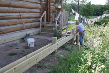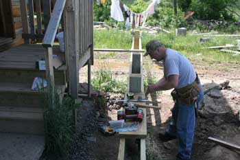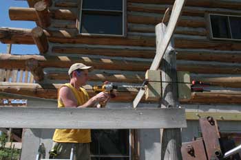 Drilling a hole in the bottom of the first of three log poles for the back deck support. These three poles will sit on rebar pins in 8" tall concrete risers along the edge of the patio. |