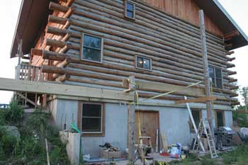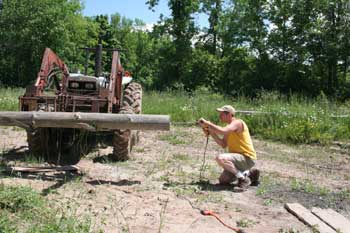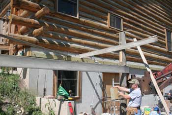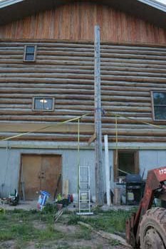 The first of the two tall support logs is on its pin and ready to be braced. |