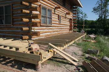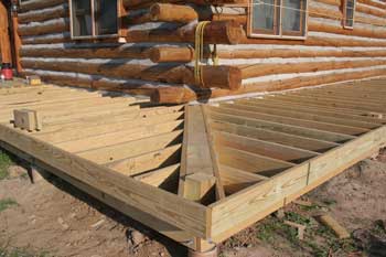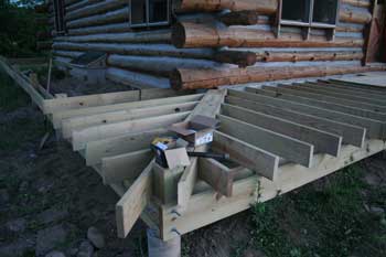 We decided to build the corners with a diagonal joist on each side of the corner 6x6 post, and put a filler board between them. This will allow us to lay out a 45-degree pattern with the flooring boards. |